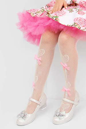 Лёгкие, капроновые колготки, в мелкую сетку, декорированные бантиками из кружева. Модель прекрасно подойдет как для торжественных мероприятий, так и для повседневного образа.
