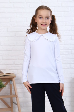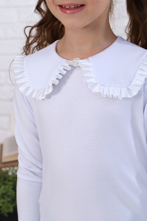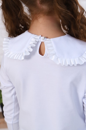 Блузка школьная для девочки с трикотажными длинными рукавами, круглым вырезом горловины, с воротником с концами квадратной формы, с центральной застежкой на спинке на петлю и пуговицу, между верхним и нижним воротником вставлена атласная лента в складку, спереди по центру горловины прикреплена брошь. Сшита из мягкого хлопкового трикотажного материала с добавлением в состав хлопка 92% и лайкры 8 %. Школьная форма украсит и дополнит любой образ не только в школу, но и для повседневной носки, на день рождения, фотосессию и для особых случаев. Блузка отлично сидит по фигуре, движения в ней комфортные, позволяет выглядеть ребенку изящно. Хорошо смотрится в сочетании с юбками, сарафанами, брюками, со школьным костюмом, отлично сохраняют цвет и форму при активной носке и после многократных стирок. Используемый материал блузки мягкий и приятный телу, устойчив к износу, не садится, не образует катышек на поверхности, имеет эффектный внешний вид.