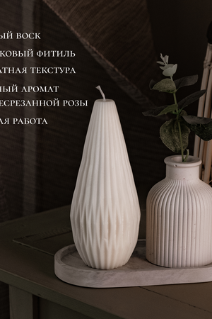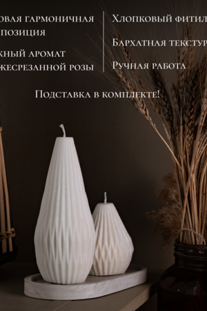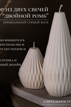 Набор Свечей из Соевого воска с хлопковым фитильком – включает две свечи высотой 17 см и 9 см. Это готовая гормоничная композиция, которая станет прекрасным декором Вашего интерьера. Свечи Двойной ромб- это стиль и эстетика, эксклюзивный дизайн весом 285гр и 130 гр. Изделия обладает кремовым оттенком , бархатной текстурой и нежным ароматом свежесрезанной розы. Прекрасно впишется в любое пространство и наполнит его теплом и уютом.
