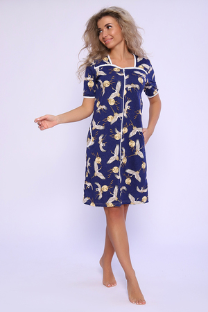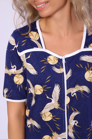 Халат на молнии с короткими рукавами и карманами в боковых швах. Полочка с отрезными кокетками и квадратным вырезом горловины. Рукава, горловина, кокетки и карманы окантованы гладкокрашеной тканью.
