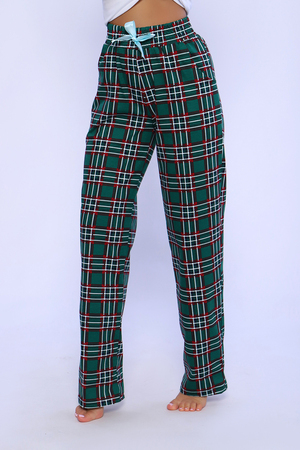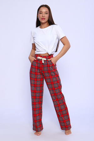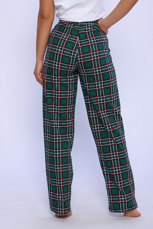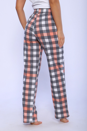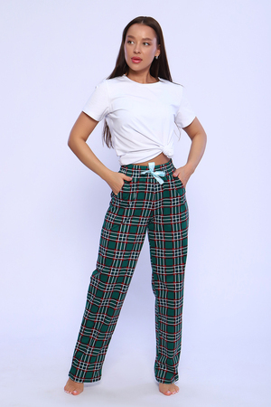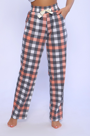 Брюки женские из трикотажного полотна с набивным рисунком. Полуприлегающего силуэта, с отрезным поясом на эластичной резке, карманом формы "хулиган" и декоративным атласным бантом. Низ изделия подогнут.