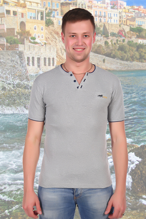 Мужская футболка. Горловина с V-образным вырезом с отделкой другой тканью и пуговицами, на груди небольшой принт, короткие рукава, прямой силуэт