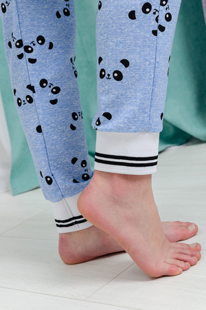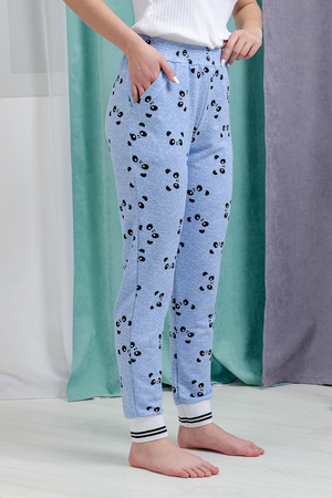 Брюки на поясе, с боковыми карманами, с эластичным манжетом внизу.