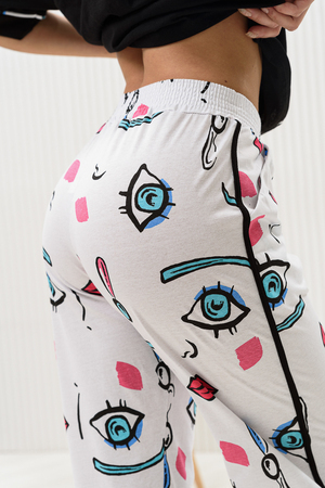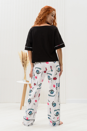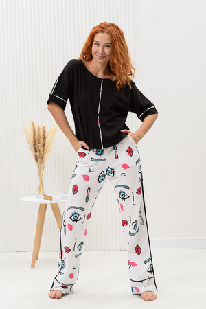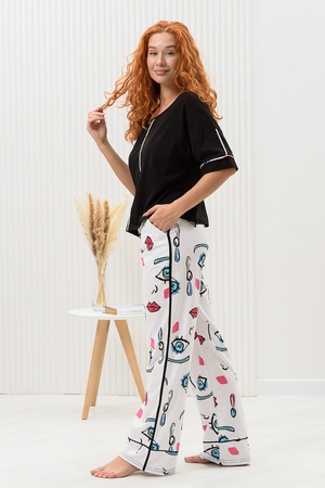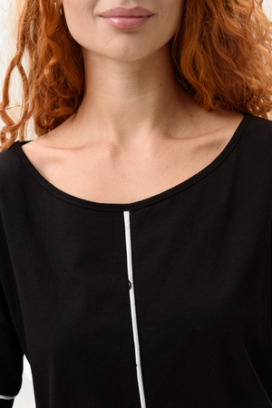 Костюм состоит из туники и брюк. Туника с округлой горловиной, свободная. Рукав короткий, с манжетом. Горловина обработана бейкой из основного полотна. Брюки прямые, на поясе, с боковыми карманами, с отделочным лампасом вдоль боковых швов.
