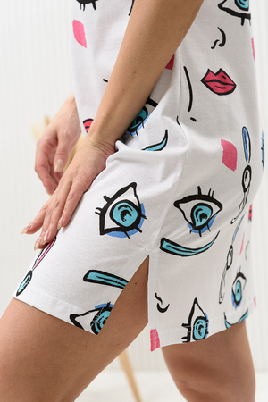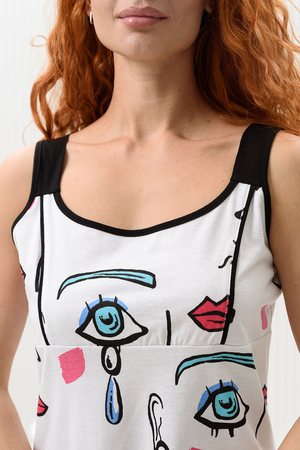 Сорочка на широких бретелях, полуприлегающего силуэта, длиной выше колена, с обработанными разрезами с нижней части боковых швов. Полочка с кокеткой. Проймы, бретели и горловина полочки обработаны бейкой из отделочного полотна.