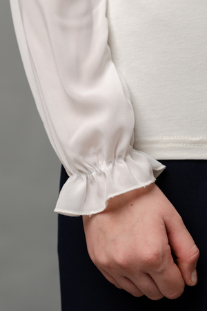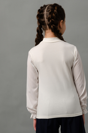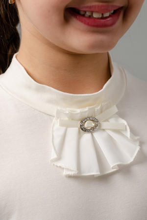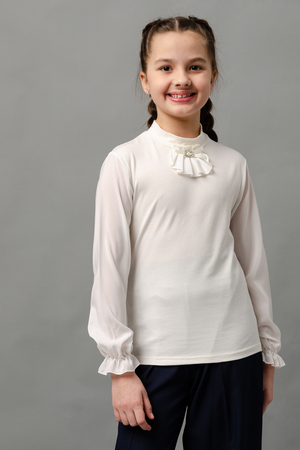 Блузка школьная для девочки с шифоновыми длинными рукавами, круглым вырезом горловины, без застёжки, сшита из однотонного полотна с добавлением в состав хлопка 92% и лайкры 8 %, и шифона, воротник - стойка, с жабо (пришито!) и брошкой, низ рукава собран на резинку, жабо со складками и декоративным элементом. Школьная форма украсит и дополнит любой образ не только в школу, но и для повседневной носки, на день рождения, фотосессию и для особых случаев. Блузка для девочки школьная отлично сидит по фигуре, движения в ней комфортные, позволяет выглядеть ребенку изящно. Хорошо смотрятся в сочетании с юбками, сарафанами, брюками, со школьным костюмом, отлично сохраняют цвет и форму при активной носке и после многократных стирок. Используемый материал блузки мягкий и приятный телу, устойчив к износу, не садится, не образует катышек на поверхности, имеет эффектный внешний вид.