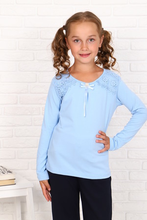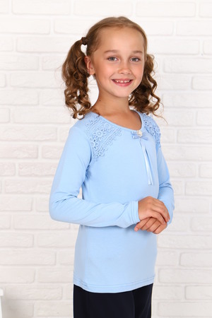 Блузка школьная для девочки с трикотажными длинными рукавами, круглым вырезом горловины, по центру горловины прикреплена брошь, без застёжки. На передней части блузки настрочено кружево. Сшита из мягкого хлопкового трикотажного материала с добавлением в состав хлопка 92% и лайкры 8 %. Школьная форма украсит и дополнит любой образ не только в школу, но и для повседневной носки, на день рождения, фотосессию и для особых случаев. Блузка отлично сидит по фигуре, движения в нем комфортные, позволяет выглядеть ребенку изящно. Хорошо смотрится в сочетании с юбками, сарафанами, брюками, со школьным костюмом, отлично сохраняют цвет и форму при активной носке и после многократных стирок. Используемый материал блузки мягкий и приятный телу, устойчив к износу, не садится, не образует катышек на поверхности, имеет эффектный внешний вид.