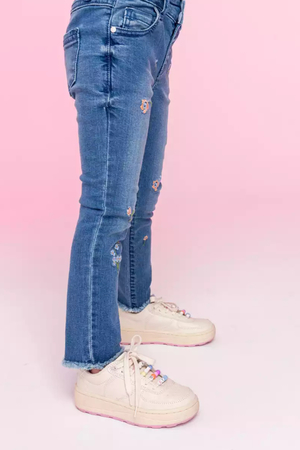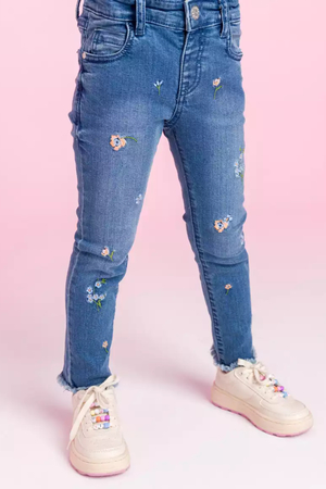 Стильные джинсы с эффектом потёртостей декорированы изящной вышивкой. По низу брючин небольшая бахрома. Модель дополнена функциональными карманами. Сочетайте вещь с любыми футболками и рубашками и получайте новые крутые образы на каждый день.