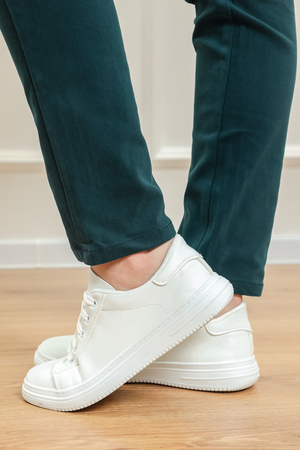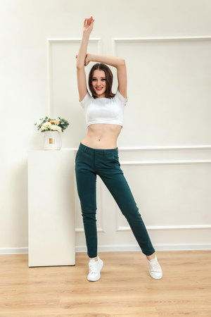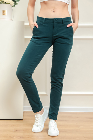 Женские брюки выполнены из плотной хлопковой ткани с добавлением полиэстера для прочности и долговечности.