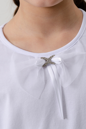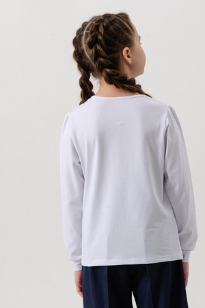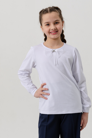 Блузка школьная для девочки с трикотажными длинными рукавами, круглым вырезом горловины, без застёжки, прилегающего силуэта, по центру переда настрочен бант из сетки, спереди прикреплен съёмный декоративный элемент, рукава на манжетах. Сшита из однотонного мягкого хлопкового трикотажного материала с добавлением в состав хлопка 92% и лайкры 8%. Школьная форма украсит и дополнит любой образ не только в школу, но и для повседневной носки, на день рождения, фотосессию и для особых случаев. Блузка отлично сидит по фигуре, движения в нем комфортные, позволяет выглядеть ребенку изящно. Хорошо смотрится в сочетании с юбками, сарафанами, брюками, со школьным костюмом, отлично сохраняют цвет и форму при активной носке и после многократных стирок. Используемый материал блузки мягкий и приятный телу, устойчив к износу, не садится, не образует катышек на поверхности, имеет эффектный внешний вид.