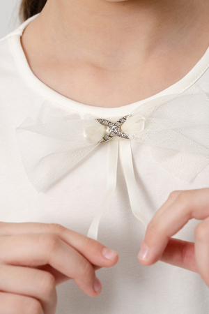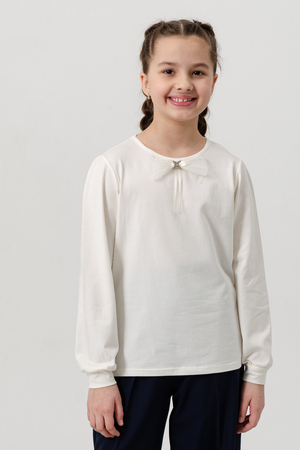 Блузка школьная для девочки с трикотажными длинными рукавами, круглым вырезом горловины, без застёжки, прилегающего силуэта, по центру переда настрочен бант из сетки, спереди прикреплен съёмный декоративный элемент, рукава на манжетах. Сшита из однотонного мягкого хлопкового трикотажного материала с добавлением в состав хлопка 92% и лайкры 8%. Школьная форма украсит и дополнит любой образ не только в школу, но и для повседневной носки, на день рождения, фотосессию и для особых случаев. Блузка отлично сидит по фигуре, движения в нем комфортные, позволяет выглядеть ребенку изящно. Хорошо смотрится в сочетании с юбками, сарафанами, брюками, со школьным костюмом, отлично сохраняют цвет и форму при активной носке и после многократных стирок. Используемый материал блузки мягкий и приятный телу, устойчив к износу, не садится, не образует катышек на поверхности, имеет эффектный внешний вид.