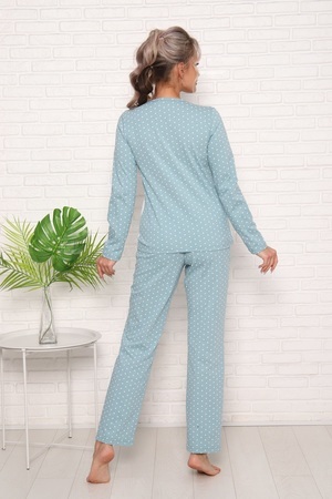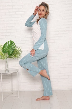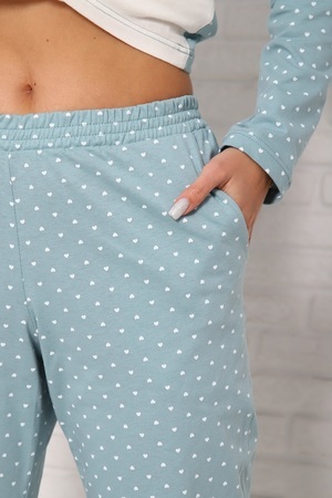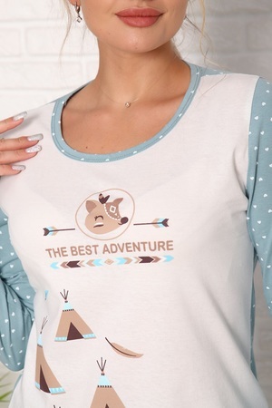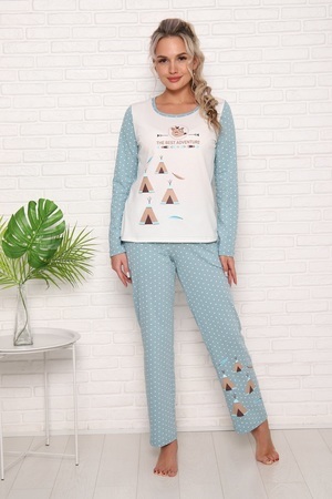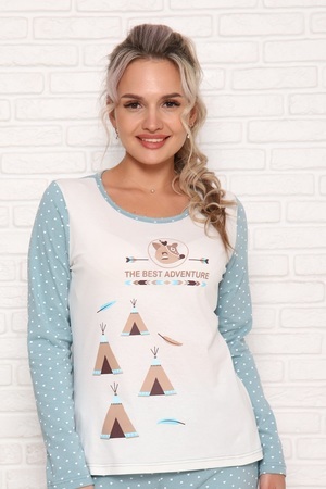 Пижама женская, брюки свободного кроя с карманами в боковых швах, принт на левой брючине; футболка с длинными рукавами и с принтом на полочке.