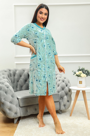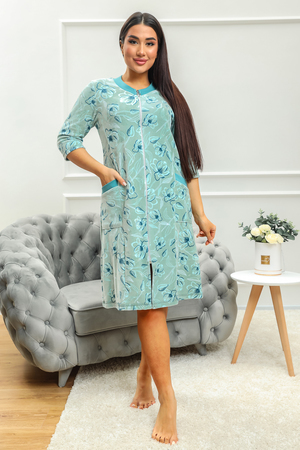 Халат женский на серебристой молнии выполнен из набивного велюра. Халат с рукавом 3/4, головина и карманы отделаны тканью контрастного цвета. Халат идеально подойдет для дома и отдыха.