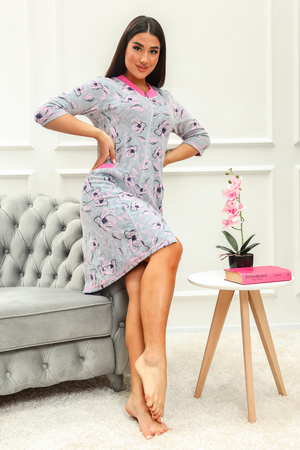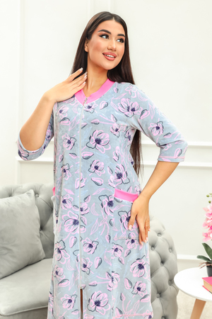 Халат женский на серебристой молнии выполнен из набивного велюра. Халат с рукавом 3/4, головина и карманы отделаны тканью контрастного цвета. Халат идеально подойдет для дома и отдыха.