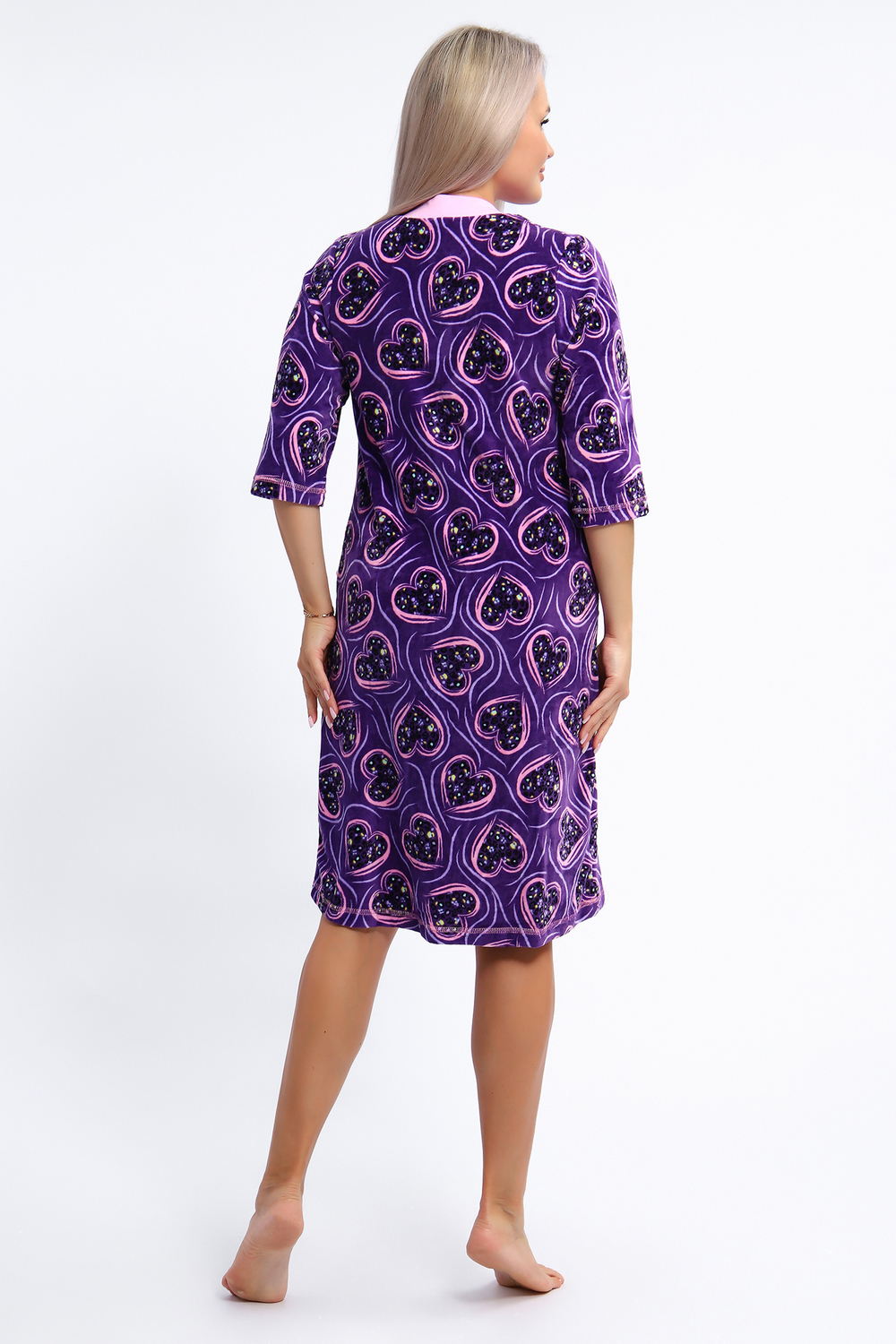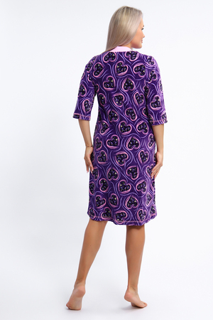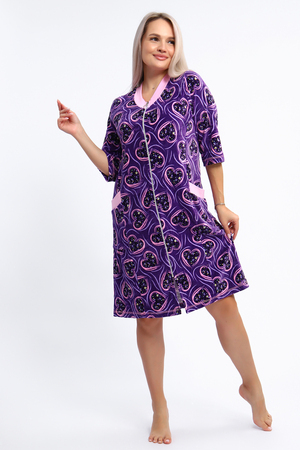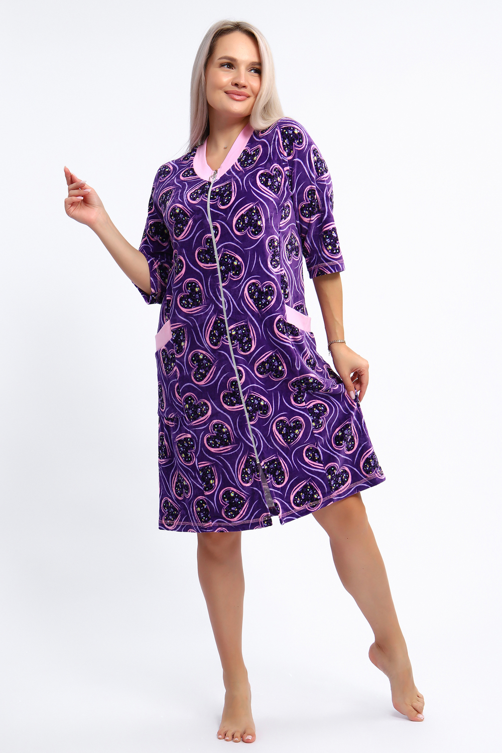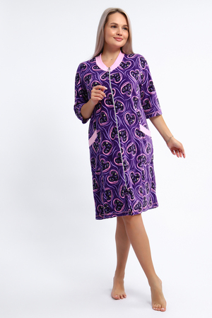 Халат женский на серебристой молнии выполнен из набивного велюра. Халат с рукавом 3/4, головина и карманы отделаны тканью контрастного цвета. Халат идеально подойдет для дома и отдыха.