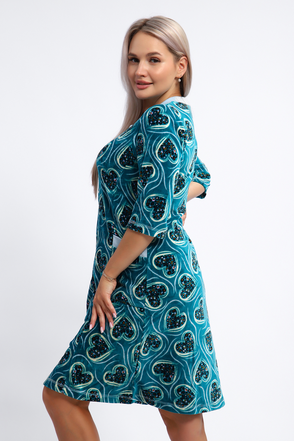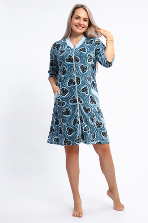 Халат женский на серебристой молнии выполнен из набивного велюра. Халат с рукавом 3/4, головина и карманы отделаны тканью контрастного цвета. Халат идеально подойдет для дома и отдыха.