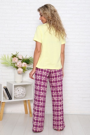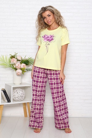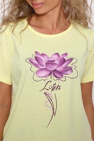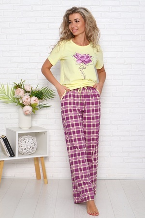 Пижама женская "Лотос": брюки прямого свободного кроя с карманами в боках и отделочным шнурком на поясе, футболка с короткими рукавами и с принтом на полочке.