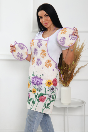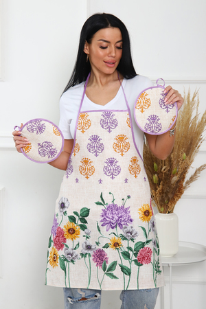 Кухонный набор включает в себя самые необходимые предметы на кухне - фартук и две прихватки, изготовлен из прочного хлопчатобумажного полотна - рогожка. Яркие насыщенные цвета не потускнеют после множества стирок.