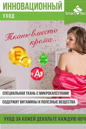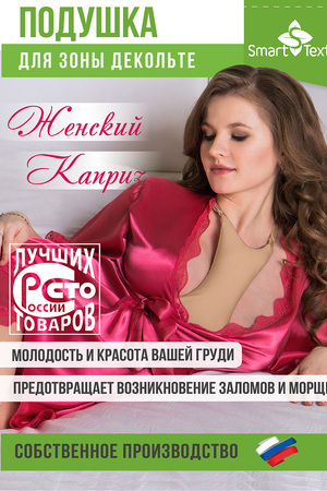 Подушечка для зоны декольте «Женский каприз» - это уникальная разработка, получившая достойную оценку не только представительниц прекрасного пола за свою эффективность в сохранении красоты, молодости и здоровья женской груди, но и стала победителем конкурса "100 лучших товаров России". Подушечки для декольте серии «Омоложение» изготовлены с применением специальной ткани с микрокапсулами, содержащими витамины и полезные вещества для кожи. Витамин Е, витамин А, антиоксиданты, алое вера постепенно высвобождаются из микрокапсул во время использования подушечки, ухаживают за кожей, сохраняя ее молодость и здоровый вид. Форма подушечки разработана с учетом анатомического строения области декольте, напоминает песочные часы. Подушечка очень деликатно и комфортно поддерживает грудь во время сна на боку или на животе, не давая коже сдавливаться и образовывать морщины. Эффект от использования подушечки во время сна заметен уже через неделю-две – кожа декольте становится гладкой, исчезают морщины, образующиеся после сна. Использование подушечки для декольте полезно не только в плане сохранения красоты. Поддержка груди и защита ее от сдавливания является эффективной профилактикой развития заболеваний молочных желез. Полезно использовать подушечку для декольте во время беременности и лактации.