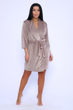 Женственный халатик  на запах с поясом полуприлегающего силуэта длиной чуть выше колена с воротником - шалькой. Выполнен из нежной бархатной ткани приятных оттенков - велюра, которая очень приятна к телу, в меру теплая и практически не мнется, что делает ношение вещи удобнее. Халат оснащен внутренним поясом. По краю борта декоративная отстрочка шириной 0,5 см. Рукав втачной длиной 3/4. Укороченная длина рукава удобна для ношения на кухне. Два кармана с фигурным входом расположены в боковых швах. На уровне талии две петли для пояса. Низ изделия и рукава подогнуты на плоскошовной машине, длина пояса 170 см. Халат на запах - незаменимая вещь в гардеробе каждой женщины, комфортна в ношении и может быть прекрасным подарком для любимых.
