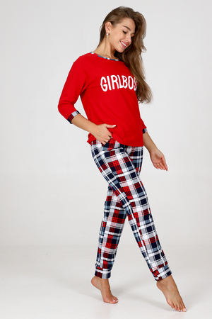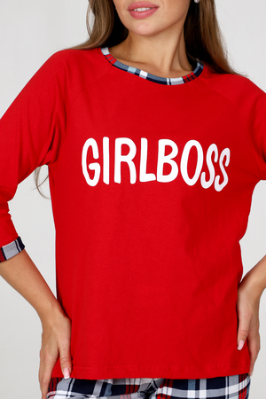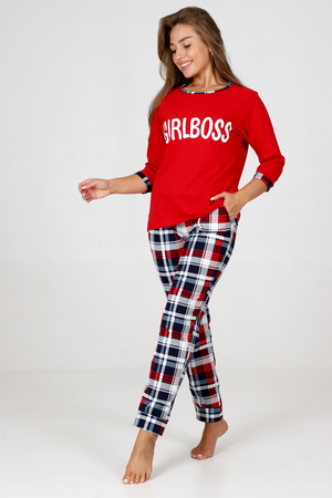 Пижама женская удобная и уютная вещь на каждый день. Джемпер с отделкой обтачки и манжеты контрастной тканью, стильная печать на груди, брюки зауженного кроя с карманами, манжеты внизу брюк.