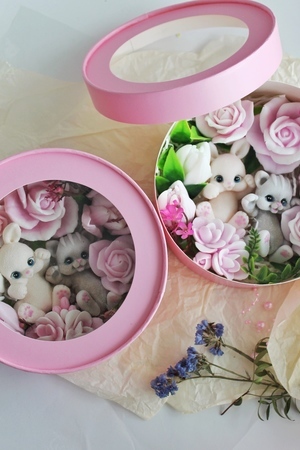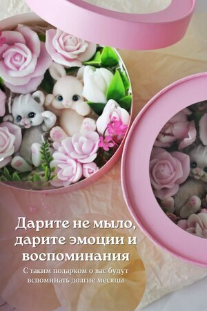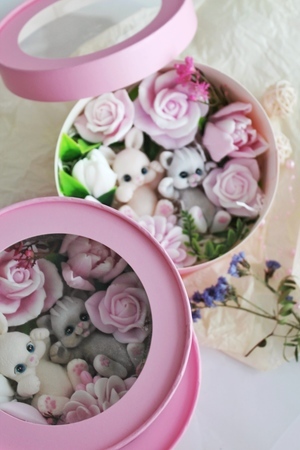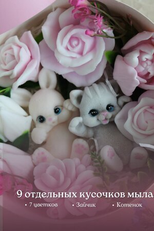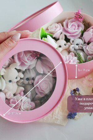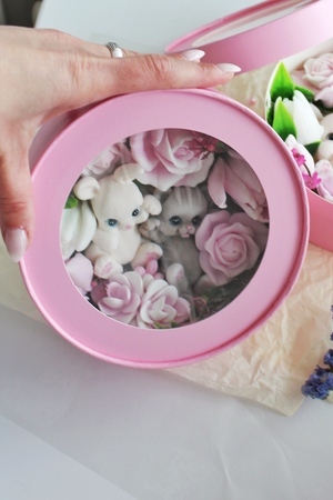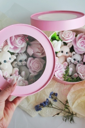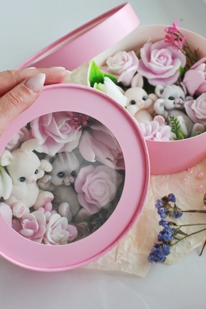 Мыло ручной работы из чистых, натуральных материалов. Бокс шайба со зверьками. Макси размер. Данная композиция имеет фруктовый запах. Это полезный, приятный и практичный подарок. Вы можете использовать его как по назначению, так и для декора ванной комнаты. Цветочная композиция - это прекрасный подарок подруге, маме, коллеге, любимой на 8 марта, день рождение и не только. В боксе находиться 9 разных кусочков мыла ручной работы. 7 цветов и 2 фигурки - зайчонок и котенок. Набор с цветами и зверушками упакован в коробку с прозрачной крышкой. Цветы не завянут, а будут радовать нежным ароматом долгое время. Главное наше отличие: Аккуратность выполнения, грамотное колорирование цветов, устойчивый аромат. Дарите Эмоции! Вес +- 370 гр. Это крупный достойный подарок на разные праздники и просто так! Не сушит кожу из-за добавления глицерина и ухаживающих масел! В составе натуральные компоненты без парабенов, сульфатов и нефтепродуктов! Состав: Мыльная основа Soaptima. Пищевые красители, парфюмированная отдушка. Ухаживающие добавки в виде небольшого ввода масел.