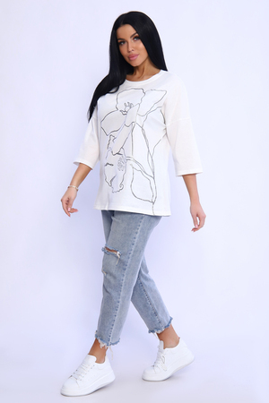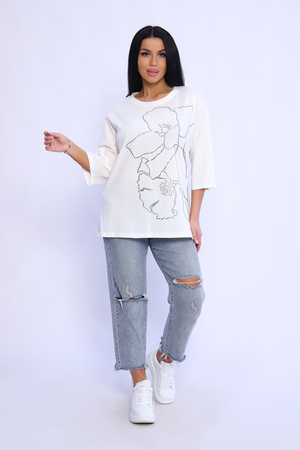 Туника из натурального хлопка прекрасный вариант для повседневного образа. Будет комфортна и как базовый вариант к классическим брючкам, так и к стилю "спортшик". Принт в виде большого цветка лилии с использованием глиттера и техники объёмной печати украшает модель, придавая ей изысканный вид. Обработка деталей вкруговую с закрепкой, рукав длиной 3/4, горловина втачная из основной ткани. Большие размеры!