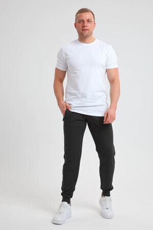 Мужские, спортивные брюки. Пояс на резинке, по бокам два кармана с молнией. Низ на манжетах. Они изготовлены из высококачественного трикотажа, за счет чего штаны не вытягиваются на месте колен и не теряют свой вид. Удобная, приятная к телу ткань и не ограничивает движения. Подойдут для спорта, отдыха и повседневной носки.
