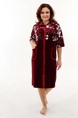 Халат женский на молнии, воротник круглый, в боковых швах два полупояса, рукав длиной до локтя. В наличии есть большие размеры. Ткань велюр.