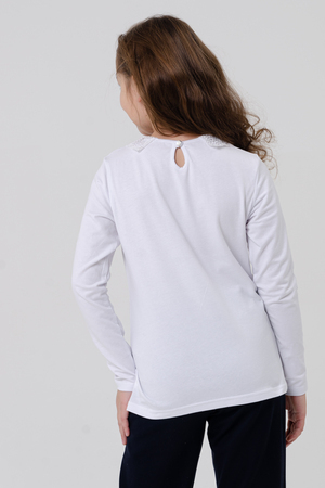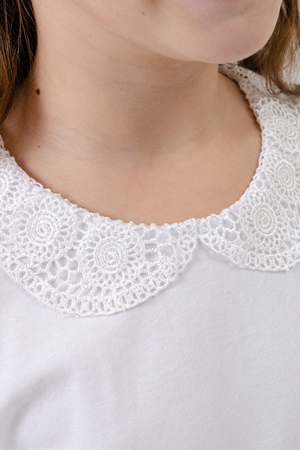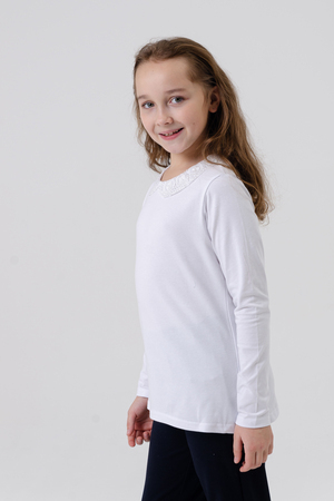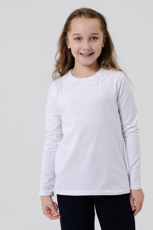 Блузка школьная для девочки с трикотажными длинными рукавами, круглым вырезом горловины, с кружевным воротником, полуприлегающего силуэта, с центральной застежкой на петлю и пуговицу на спинке. Сшита из однотонного мягкого хлопкового трикотажного материала с добавлением в состав хлопка 92% и лайкры 8 %. Школьная форма украсит и дополнит любой образ не только в школу, но и для повседневной носки, на день рождения, фотосессию и для особых случаев. Блузка отлично сидит по фигуре, движения в нем комфортные, позволяет выглядеть ребенку изящно. Хорошо смотрится в сочетании с юбками, сарафанами, брюками, со школьным костюмом, отлично сохраняют цвет и форму при активной носке и после многократных стирок. Используемый материал кофты мягкий и приятный телу, устойчив к износу, не садится, не образует катышек на поверхности, имеет эффектный внешний вид.