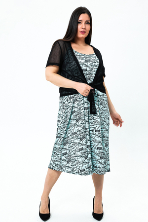 Костюм женский: Сарафан и туника. Сарафан полуприлегающего силуэта, слегка расширенный к низу, бретели из окантовки, в боковом шве внутренние карманы. Туника из тонкой хлопчатобумажной сетки, прямая. Рукав втачной короткий. Пояс переходит в завязки.