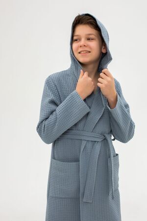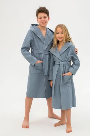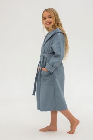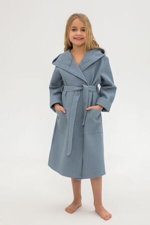 Халат вафельный детский. Модель с капюшоном на запах, с поясом в тон. Вафельное полотно 100% хлопок, плотностью 242 гр/м. Халат отлично подойдет как для дома, так и для бани, и для сауны или бассейна. Домашний халат - удобная и стильная удлиненная модель с глубоким капюшоном и длинным рукавом. Вафельный банный халат отлично впитывает влагу, дышит и очень приятен к телу.