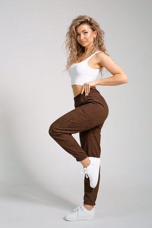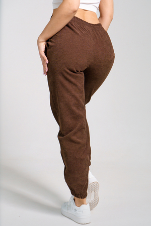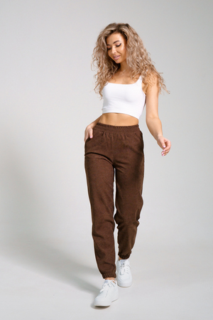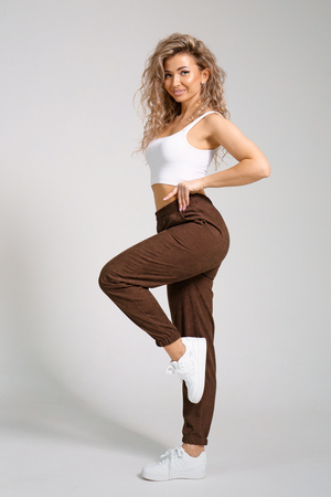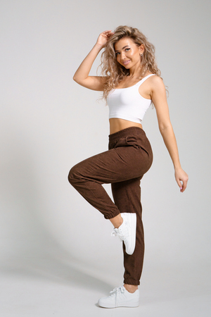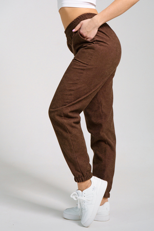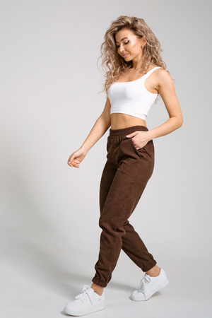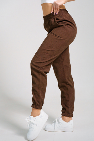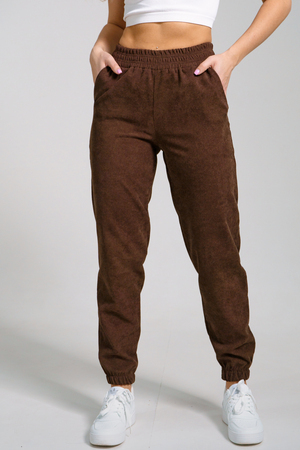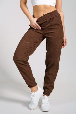 Женские стильные брюки - бананы выполнены из качественного вельвета, что увеличивает долговечность изделия, придавая ему прочность.  Вельвет практичен, прост в уходе и использовании. Обладает высокой износоустойчивостью, прочностью, не деформируется и не вытягивается, приятен к телу, не мнётся и не выцветает. Материал гигроскопичен, хорошо пропускает воздух и сохраняет тепло.  Высокая посадка, вместительные боковые карманы, удобный и качественно обработанный на специальной машине пояс - резинка позволит Вам чувствовать себя максимально комфортно. Такой фасон брюк формирует выразительный женственный силуэт, скрывает мелкие недостатки фигуры и гармонизирует пропорции. Всё это образует идеальное решение для лука на каждый день, проведённый вами дома, на работе, в школе  и на отдыхе.