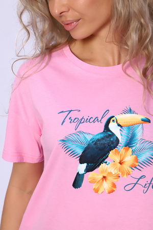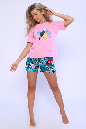 Женский домашний костюм-пижама, состоящий из футболки Тукан и шорт Листья из трикотажного полотна 100%-го хлопка. Приятный дышащий материал идеален для изготовления домашней одежды. Футболка свободного кроя, с круглой горловиной и втачным спущенным коротким рукавом, в которой будет одинаково приятно спать и заниматься домашними делами. Оригинальный принт обязательно поднимет настроение. Шорты прямого силуэта свободного кроя, с карманами в боковых швах. Мягкий удобный пояс на резинке не перекрутится, т.к отстрочен на поясной машине. Пижамка не изменит свой внешний вид после стирки при соблюдении рекомендаций по уходу и будет долго вас радовать. Обязательно возьмите этот костюм в отпуск. Отличный подарок для всех девушек и женщин на любой праздник!