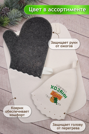 Наш оригинальный набор для бани включает в себя шапку, рукавицу и коврик. Это незаменимые аксессуары для любителей попариться в бане и сауне. Шапка защитит волосы от сухости и ломкости, голову от перегрева и предотвратит появление головокружения. Рукавицы – это повышение комфорта при использовании банного веника и безопасность ваших рук от появления ожогов. А индивидуальный коврик защитит от высоких температур при контакте с горячей лавкой в парилке. Оригинальная вышивка выполнена качественно и не сотрётся в процессе использования. На изделиях имеются петельки, с помощью которых их можно повесить на крючок в предбаннике. Такой набор станет отличным подарком для любителей отдыха в бане или сауне.