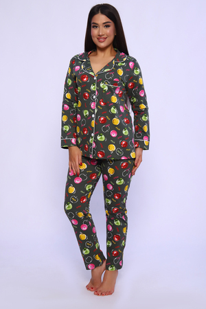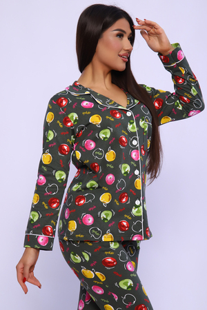 Пижама свободного кроя из мягкой хлопчатобумажной ткани. Комплект состоит из кофты и брюк. Кофта с длинным рукавом, на пуговках и с карманом на груди. Атласный кант по подборту, воротнику, карману и манжету. Брюки прямые с карманами. Эта пижама отлично подойдет как домашний костюм, так и для сна. А расцветка сочные яблоки поднимет настроение.