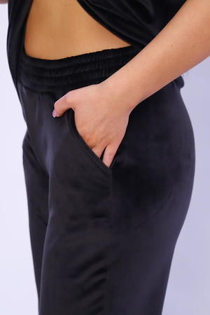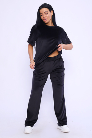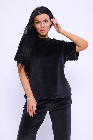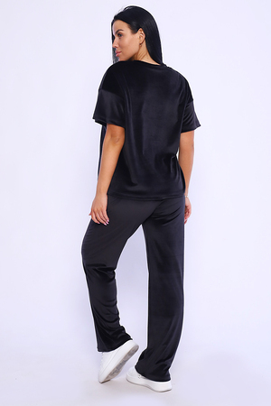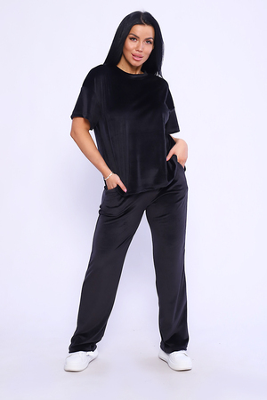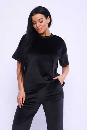Костюм женский велюровый, повседневный, всесезонный. Костюм состоит из футболки и брюк. Футболка оверсайз прямого силуэта, длиной до бедра. Рукав втачной со спущенным плечом, длиной чуть выше локтя. Горловина с обтачкой, низ футболки с подгибкой. Брюки прямого силуэта, умеренного объема. На передних половинках брюк карманы с отрезным бочком. Пояс притачной с эластичной тесьмой. Низ брюк подгибка. Замеры объема талии брюк по нерастянутой резинке.