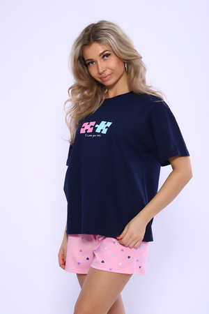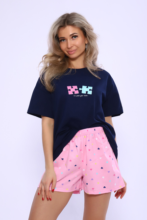 Женский домашний костюм - пижама, состоящий из футболки и шорт Сердечки из трикотажного полотна 100%-го хлопка. Приятный дышащий материал идеален для изготовления домашней одежды. Футболка свободного кроя, с круглой горловиной и втачным спущенным коротким рукавом, в которой будет одинаково приятно спать и заниматься домашними делами. Оригинальный принт обязательно поднимет настроение. Шорты прямого силуэта свободного кроя. Пижамка не изменит свой внешний вид после стирки при соблюдении рекомендаций по уходу и будет долго вас радовать. Отличный подарок для всех девушек и женщин на 14 февраля, 8 марта и другие праздники!