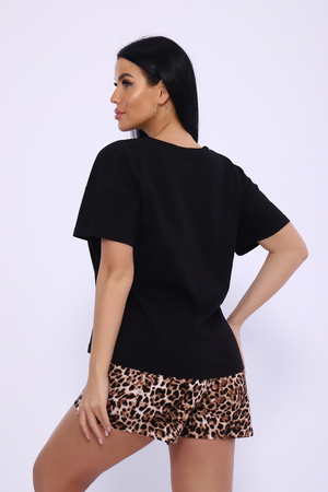Пижама женская с шортами леопард. Данная модель выполнена из трикотажного полотна кулирка хлопок 100%. Отличная модель для дома и отдыха. Футболка свободного покроя со спущенным рукавом. На полочке футболки присутствует принт.