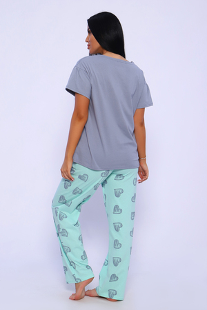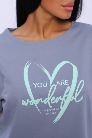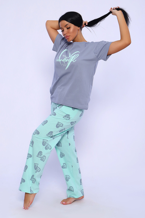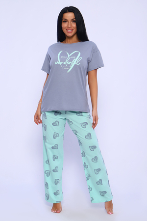 Костюм женский с оригинальным принтом в виде сердечек, из кулирки. Комплект состоит из футболки прямого кроя с рельефным пафф-принтом и прямых брюк на резинке с боковыми карманами. Футболка со спущенной фигурной проймой и свободным, слегка присборенным коротким рукавом. Домашний костюм из дышащего хлопкового трикотажа, комфортный, удобный, необходимая вещь для дома, а так же для сна.