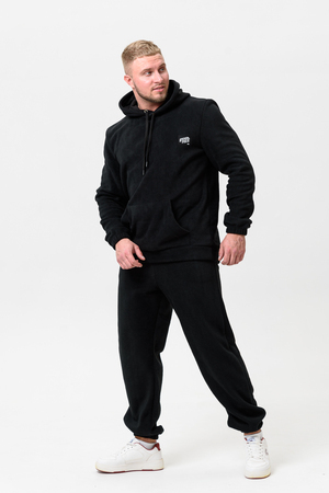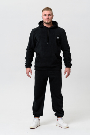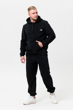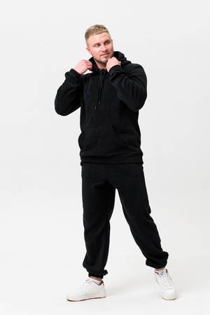 Костюм унисекс из флиса с брюками и худи. Худи с карманом кенгуру, капюшон со шнурком, нашивка в области груди. Брюки внизу на резинке, карманы в боках, нашивка под карманом. Костюм идеально подойдет для прогулок и отдыха. Размеры сдвоенные, 46-48, 50-52, 54-56.