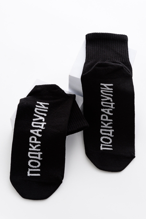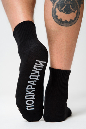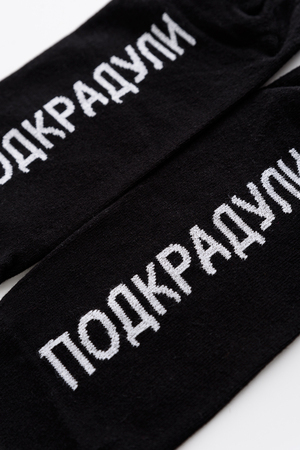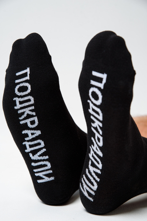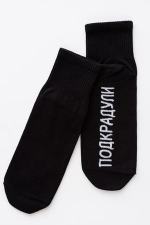 Мужские носки в комплекте 1 пара. Широкая резинка по всей верхней части носка. Надпись на стопе "Подкрадули"