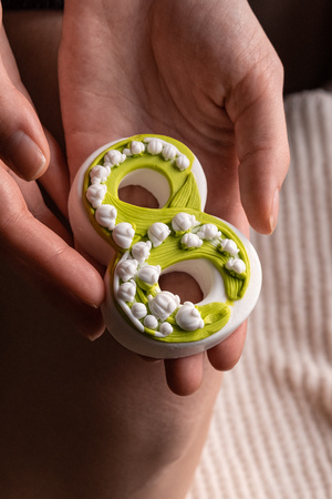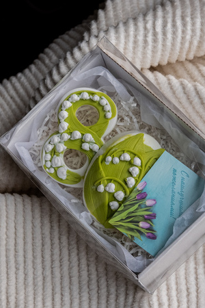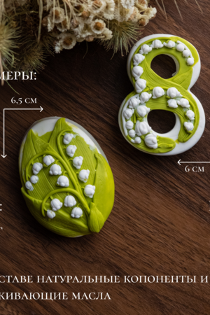 Набор ЛАНДЫШИ мыло ручной работы. Вес 8-ка -+\- 85гр. Вес букет –+\- 103гр. Размер 8-ка – 8\6см. Размер букет – 8.5\6.5см. Общий вес набора – 230 гр. Общий размер набора – 17\11.5 см. В каждом наборе подарочная открытка, нежная бумага тишью. Набор мыла «Ландыши» упакован в подарочную коробку с прозрачной крышкой - это милый и запоминающийся подарок к главному волшебному празднику 8 марта. Он не только порадует своим внешним видом, но так же будет полезен в быту! Мыльце можно использовать как декор и ароматизацию ну, а плоским мыльцем - пользоваться. Нежное мыло с мягкой ароматной пенкой и красивым дизайном вручит море положительных эмоций и детям и взрослым! Милые ландыши - прекрасная возможность порадовать и удивить необычным, красивым и нужным подарком своих близких людей, коллег, друзей. Идеальный вариант для подарка - ярко, красиво, не забываемо! Так же фигурки мыла имеют нежный фруктово-ягодный аромат и может добавить ароматы в ваш дом и быть достойным украшением интерьера. Мыло полностью ручная работа! Не сушит кожу из-за добавления глицерина и ухаживающих масел. В составе натуральные компоненты, без сульфатов и парабентов. Состав: Мыльная основа. Пищевые красители, парфюмированная отдушка. Ухаживающие добавки в виде небольшого ввода масел. Для безопасной транспортировки и сохранности товара мы используем терм усадочную пленку, что обеспечивает мылу арома-устойчивость, оно не пачкает подарочный коробку.