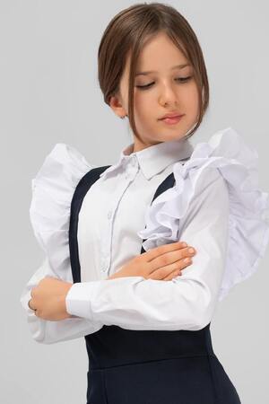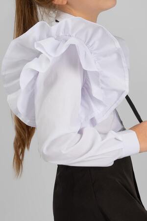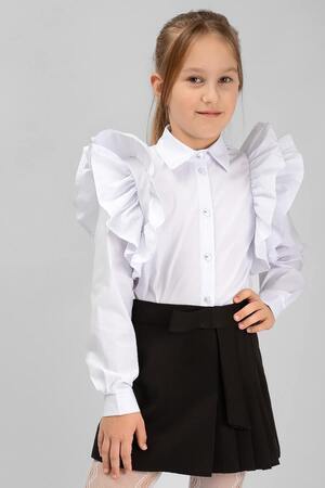 Блузка для девочки Соль&Перец. Модель с декоративной отделкой, плечи украшены пышными воланами, планка с застежкой на пуговицы. Блузка отлично сочетается с брюками, юбками и сарафанами. Прекрасно подойдет для создания эффектного школьного образа.