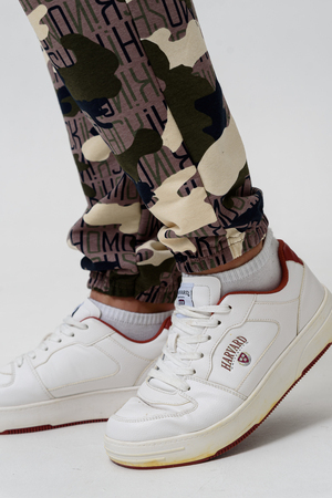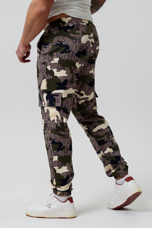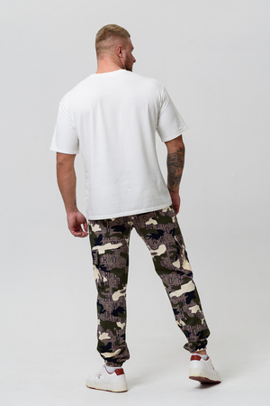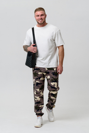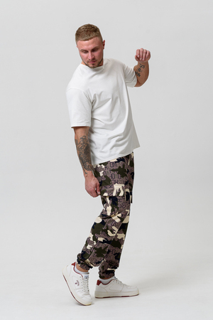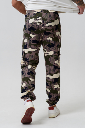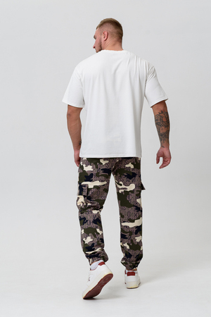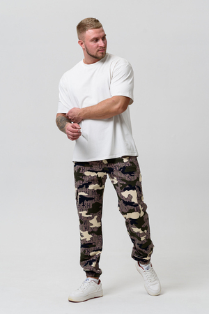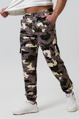 Брюки на поясе, с боковыми карманами вверху, накладными карманами с клапаном по бокам, внизу на резинке.
