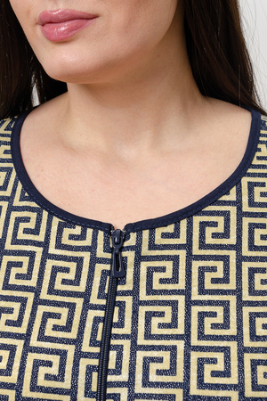 Халат на молнии, прямого силуэта, длиной выше колена, с фигурной линией низа, с удлиненной спинкой, с округлой горловиной, с накладными карманами с обтачкой из отделочного полотна. Рукав цельнокроеный, короткий, с манжетом из отделочного полотна. Горловина обработана бейкой из контрастного полотна.
