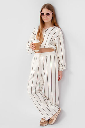 Размер 146 (рост 140-146 см) длина кофты 44 см, ОГ 86 см, длина рукава от горловины 59 см; длина брюк по бок. шву 88 см, по внутр. 62 см, ОТ 66 см, ОБ 86 см.