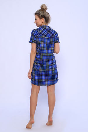 Халат на пуговицах с рубашечным воротником. Рукава короткие с отворотными манжетами. Карманы в боковых швах и на груди. Спинка с отрезной кокеткой и встречной складкой.