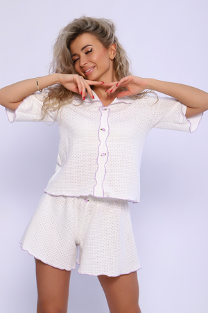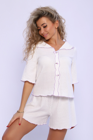 Женская пижама, выполнена из ткани - кулирка жаккард молочного оттенка. Материал фактурный, легкий, мягкий и приятный к телу. Комплект состоит из двух изделий, кофта прямого силуэта с отложными лацканами и слегка расклешенным рукавом, по центру кофты расположена имитация планки. Шорты короткие, расклешенные, на талии фиксируются резинкой шириной 2 см. Дополнительным декором в комплекте служат атласные розочки лавандового цвета как на кофте, так и на шортах. Благодаря им комплект выглядит более выразительным и нежно. Края кофты, планки и шорт обработаны в цвет основного декора. На фото, модель представлена в 46 размере. Цвет отделки может меняться в зависимости от партии.