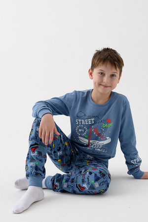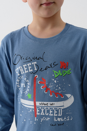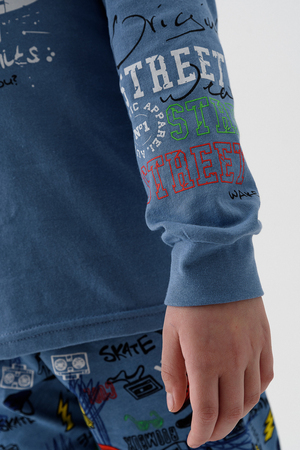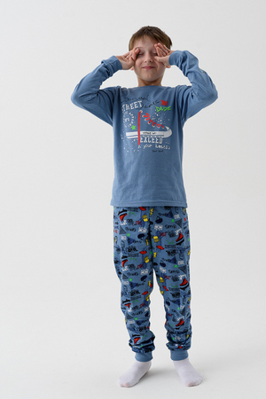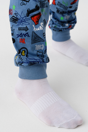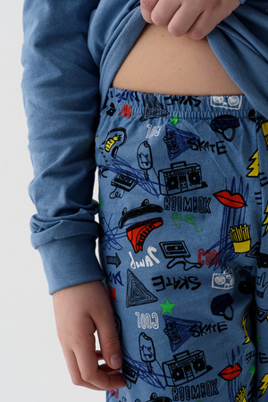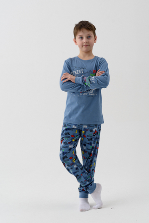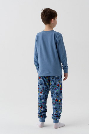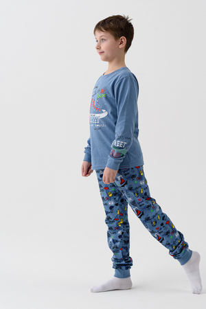 Пижама детская состоит из свободных брюк и лонгслива. Лонгслив выполнен из однотонного полотна, брюки из набивного. Манжеты рукавов и брюк и обтачка горловины выполнены из рибаны. На переднюю часть лонгслива нанесен печатный рисунок. Домашний костюм для мальчика без карманов выполнен из мягкого, легкого и комфортного трикотажа средней плотности, 100% хлопок, не сковывает движений. Стильная хлопковая пижама подойдет для сна, в садик, одежды для дома и игр с друзьями, а также для занятий спортом: гимнастики, йоги, фитнеса в домашних условиях. Манжеты на рукавах и штанах надежно фиксируются и не позволяют детской одежде сползать, что придаёт дополнительное удобство при носке пижамы. Брюки выполнены на резинке, мягко и приятно прилегают к телу, не давит на живот и не вызывает дискомфорта. Футболка с длинными рукавами согреет ребенка в прохладные дни. Пижамные штаны и лонгслив обеспечивают комфортное телесное ощущение как в летний, так и в зимний период. Комплект не садится после стирки, не линяет и не теряет яркости красок. Домашняя одежда для малышей с рисунком добавит яркости и радости в повседневную жизнь. Пижама со штанами станет приятным подарком для малыша на День Рождения. В таком комплекте ребенок будет чувствовать себя комфортно и уверенно. Детский костюм для мальчиков позволит насладиться спокойным сном и веселым настроением на новый день!